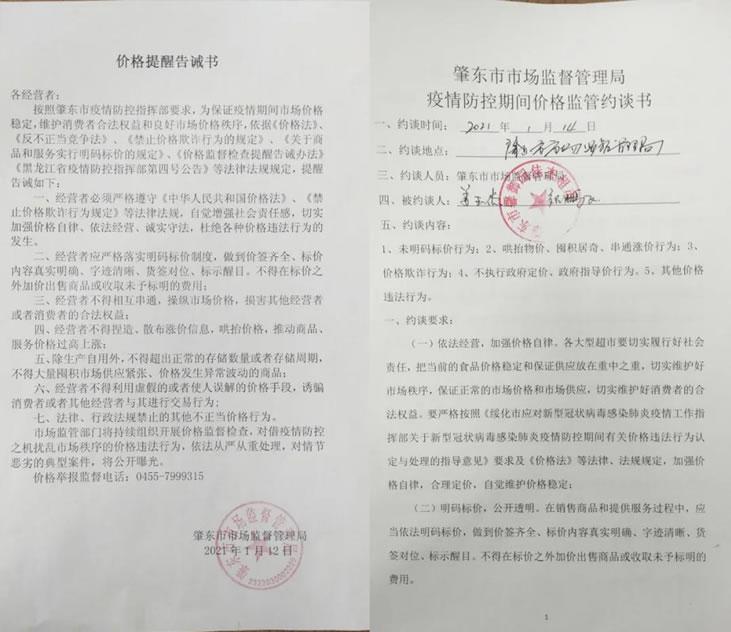 同時(shí),對(duì)全市9個(gè)大中型超市負(fù)責(zé)人進(jìn)行約談,并在《價(jià)格監(jiān)管約談書》上簽字。各基層分局監(jiān)管人員分別深入轄區(qū)經(jīng)營(yíng)商戶,發(fā)放《價(jià)格提醒告誡書》2200余份,宣傳疫情防控知識(shí)和價(jià)格管理相關(guān)的法律法規(guī),要求各市場(chǎng)主體遵紀(jì)守法,自覺維護(hù)市場(chǎng)秩序,為全市抗擊疫情貢獻(xiàn)自身力量。