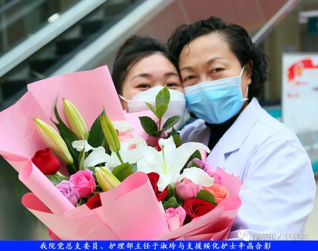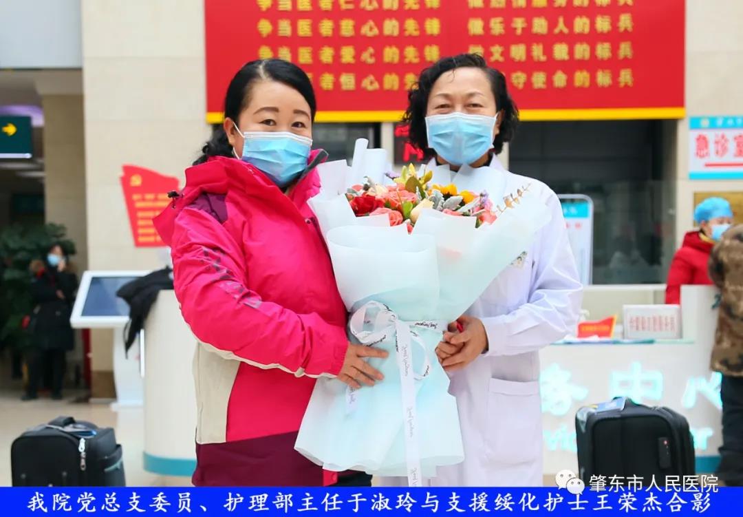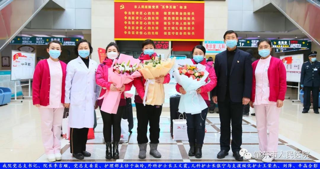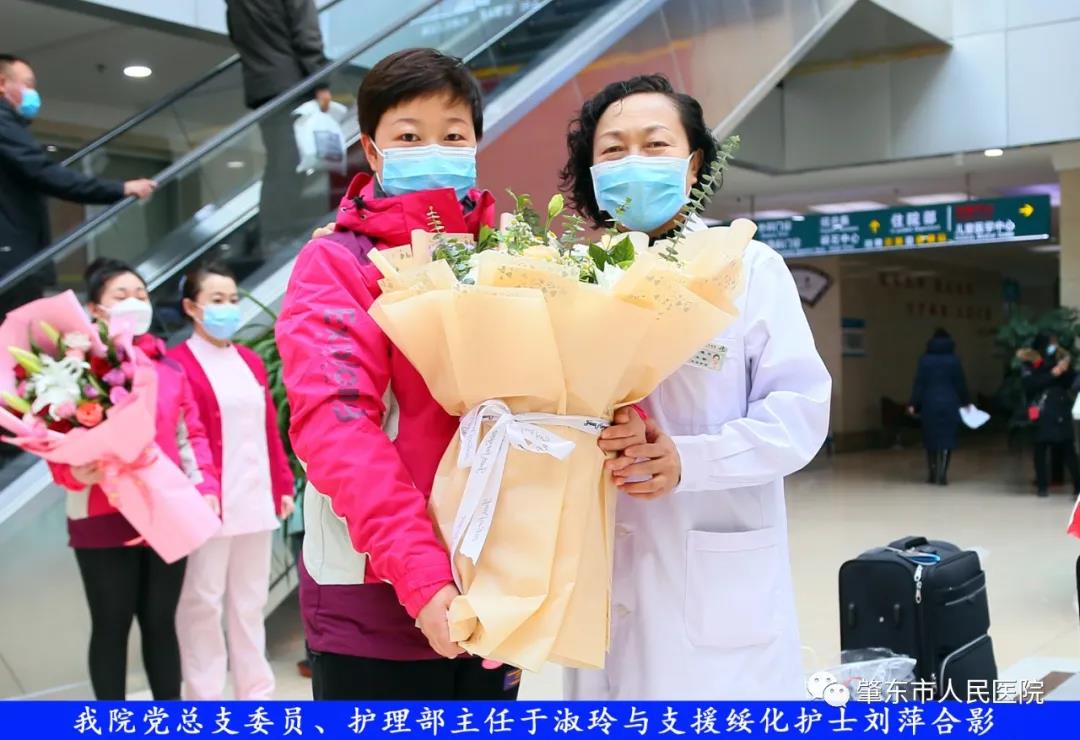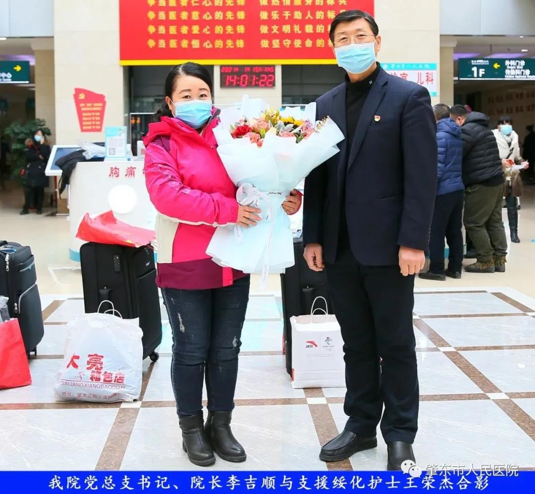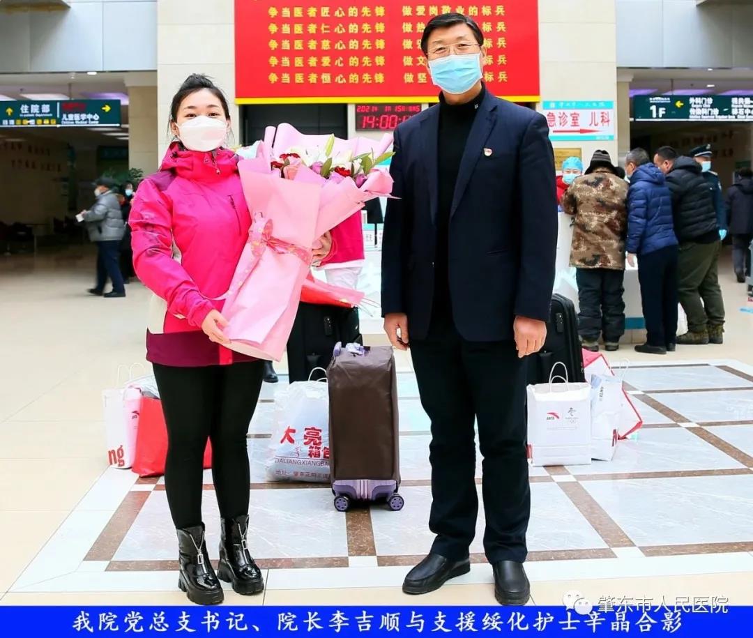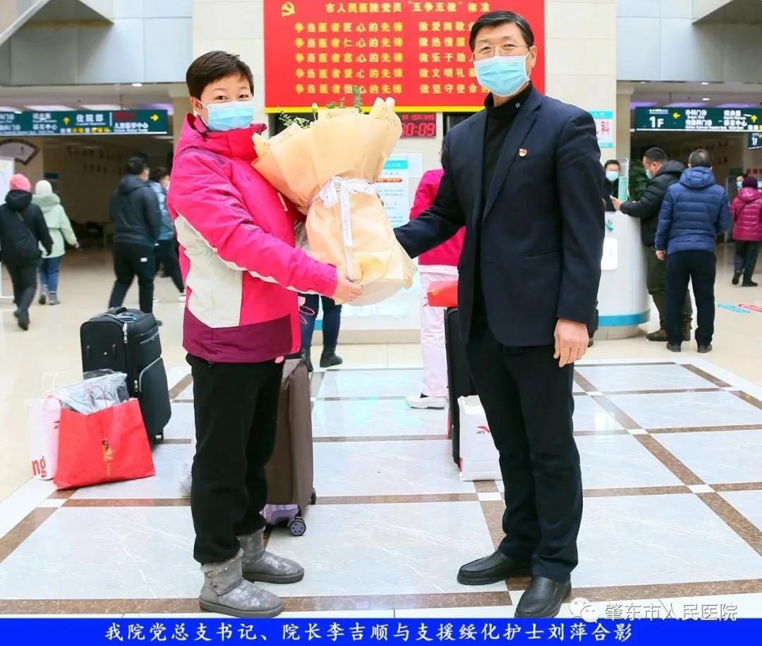 此次趕赴綏化,是我院繼趙志剛、溫明馳援湖北,欒宏偉、趙虹琪、劉文宇支援綏化后的再次出征。出發(fā)前,我院在門診大廳舉行了短暫而又莊重的歡送儀式。沒有太多的祝福和掌聲,一切都太過匆匆,大家都太過忙碌,全院醫(yī)務工作者都各自奮戰(zhàn)在如火如荼的全民抗疫工作當中,人民醫(yī)院黨總支書記、院長李吉順,黨總支委員、護理部主任于淑玲代表全院職工向三名護理工作者送去鮮花和祝福,希望她們此次出征能夠不負使命、不負重托,充分發(fā)揚崇高的職業(yè)精神,在工作當中服從指揮、服從大局,忠于職守、相互配合,同時也要注意防寒保暖,做好個人防護。并祝愿她們能夠光榮出征,平安履職,勝利凱旋。
