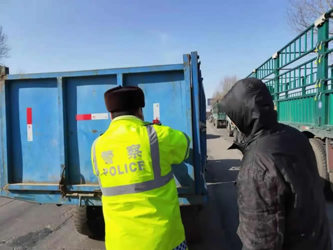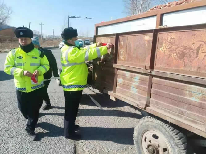 肇東交警大隊粘貼反光標(biāo)識 備春耕保安全