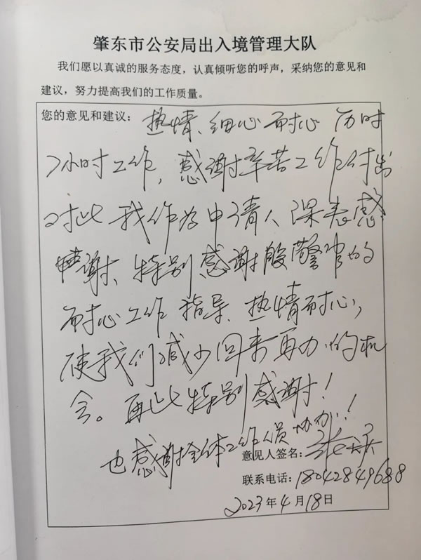 4月18日,從香港返鄉(xiāng)的肇東籍居民張先生攜妻子陳女士來到肇東市公安局出入境接待大廳,妻子陳女士是香港人,兩人此次是專程飛回來辦理張先生赴香港定居手續(xù),為了不耽誤二人的返程時間,辦證民警加班加點忙碌兩個多小時為張先生辦理通過所需辦證材料,張先生感動不已,連連說:“家鄉(xiāng)人太好了,你們出入境民警太暖心了!”當(dāng)即寫下一封感謝信表達(dá)心情。