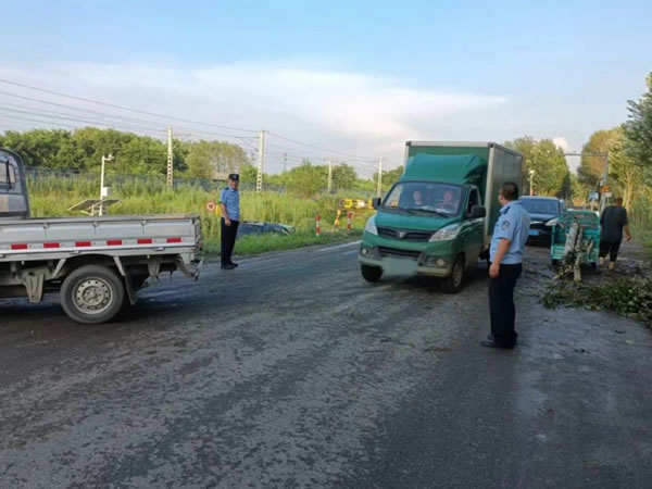 2024年7月23日下午,肇宋路上因大風(fēng)導(dǎo)致路邊大樹橫倒,嚴(yán)重影響了交通流暢,存在安全隱患。接到好心人報警后,輔警孫超、王立濤迅速趕到現(xiàn)場,并立即向所長劉景會匯報了情況。所長劉景會迅速作出反應(yīng),與尚家村領(lǐng)導(dǎo)取得聯(lián)系,并迅速組織人員前往現(xiàn)場實(shí)施救助。在村民和尚家派出所民警的共同努力下,大家齊心協(xié)力,成功將橫在路上的大樹移開,及時恢復(fù)了道路暢通,確保了過往車輛的安全通行。