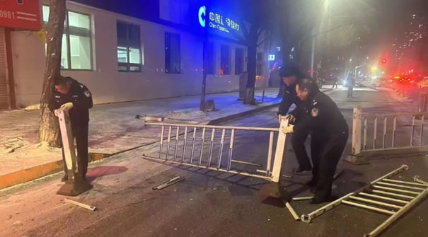 1月28日除夕當天,肇東市迎來大范圍低溫降雪,低溫降雪導致城區(qū)路段有結(jié)冰現(xiàn)象發(fā)生,過往車輛時常發(fā)生打滑失控,撞上馬路中間的護欄,變形、倒地的破損護欄嚴重影響車輛及群眾的出行安全。肇東市公安局奮斗派出所民輔警巡邏至八道街建設銀行路口時,發(fā)現(xiàn)路口中間的隔離護欄被撞壞,過往車輛紛紛避讓,影響正常的道路通行,加之天黑,稍不留神,極易造成安全事故,存在很大的安全隱患。見此情景,民警劉長軍、吳復生、王海瑩、輔警邵建壹迅速來到事發(fā)現(xiàn)場,及時將撞壞的護欄扶正擺好,把護欄移至原位,同時指揮過往車輛完全通行。經(jīng)過民警二十多分鐘的精心維護,終于把斷裂護欄修好歸位,保證了車輛行人的通行安全,受到了過往司機朋友的點贊。