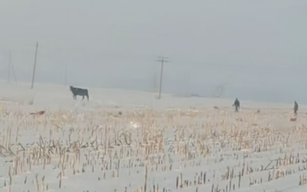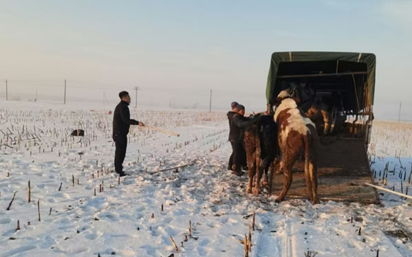 民警了解情況后為了避免瘋牛在村屯里傷害群眾,便立即組織人員開車拿著棒子等工具將瘋牛趕到了屯后的大地里。工作人員幾次試圖靠近瘋牛,但瘋?匆娪腥丝拷蜁蛉藳_過來,工作人員在幾次奔跑驅(qū)趕中摔倒在了雪地里。工作人員顧不上個(gè)人安危,但考慮到采取強(qiáng)攻制服瘋牛的策略勢必會造成人員損傷,經(jīng)過研究準(zhǔn)備采取智取方式制服瘋牛。經(jīng)過近一小時(shí)的忙碌后,這時(shí)瘋牛的情緒逐漸穩(wěn)定下來了。工作人員見時(shí)機(jī)成熟,慢慢的靠近老牛,并快速的拽住韁繩,將牛趕上了車。最后大伙一起將牛送回了李老漢的家中。