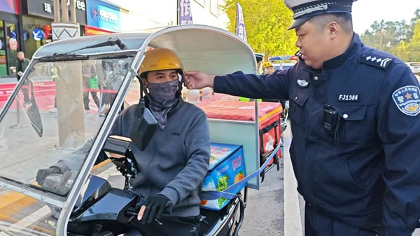 行動中,民輔警在城區(qū)電動車、摩托車通行集中路段,對摩托車、電動車逐輛進行檢查,對未正確佩戴安全頭盔的騎乘人員,現(xiàn)場講解正確佩戴頭盔的方法及佩戴頭盔的重要性和必要性。對未佩戴安全頭盔的騎乘人員進行教育、警告。并當面宣講交通安全法律法規(guī)等安全知識,詳細剖析駕乘電動車、摩托車不佩戴安全頭盔的嚴重危害和后果。尤其針對外賣、快遞等配送人員,民輔警在街頭逐一檢查車輛運行手續(xù)和安全性能、頭盔是否符合國家標準等情況,明確要求快遞配送人員必須發(fā)揮重點行業(yè)示范引領(lǐng)作用,時刻戴好安全頭盔,遵守交通法規(guī),做好交通安全的帶頭人。
