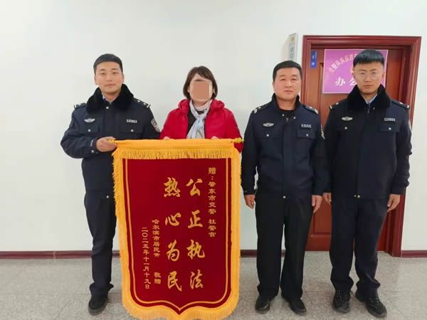 近日,哈市市民黃女士將一面鐫刻著“公正執(zhí)法、熱心為民”的錦旗送到肇東交管大隊事故中隊民警手中,由衷表達對他們的感謝之情。